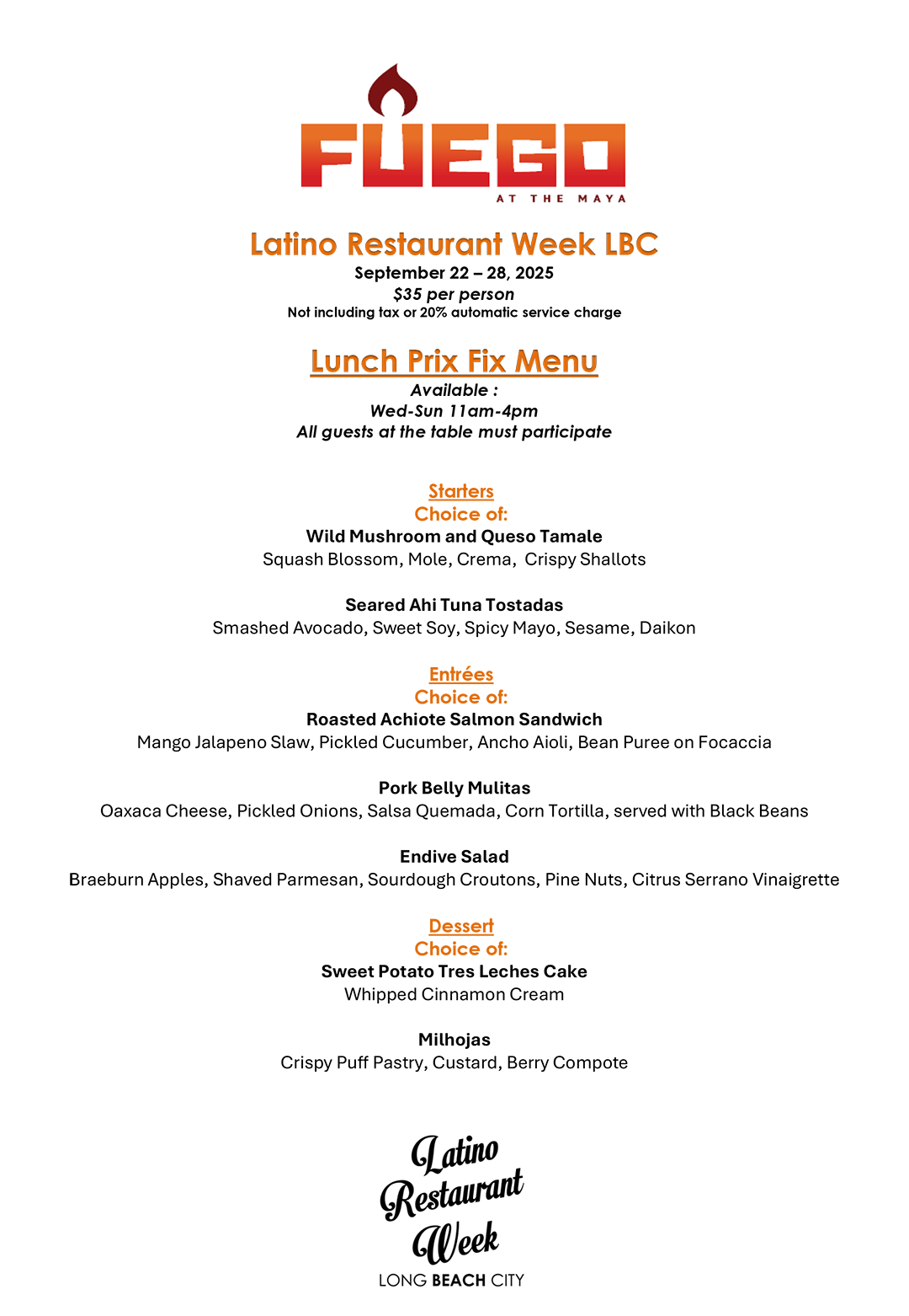 This is a special menu crafted exclusively for Latino Restaurant Week in Long Beach, taking place from September 22 – 28, 2025. During this experience, our participating restaurants are offering these unique dishes for you to enjoy. Don’t miss the chance to savor the diverse flavors and creativity our chefs have brought to life for this celebration!